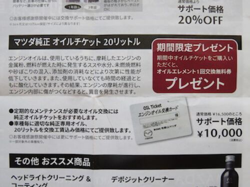 先日の記事で、マツダのオイルキープの割引キャンペーンが来ないかな?と思ってたら yasmee.hatenablog.com 早速来ましたよ。流石、自称引き寄せマスターの本領発揮です。 通常価格20L 16,500円の所、10,000円と1Lあたり500円でかなりお得。 他社の車でも粘…