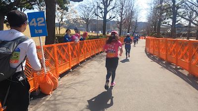 ここら辺ぐらいまではサブ4を狙ってもいいようなペース、1㎞6分切りぐらいで来ていたのだけど、25㎞ぐらいでお決まりのふくらはぎが攣る前兆が。