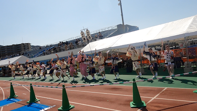 競技場では阿波踊りでのお出迎えがありました。お囃子が気持ちを高めてくれます。